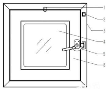 1.杀菌灯 2.杀菌灯开关 3.箱体 4.玻璃视窗 5.拉手 6.门体